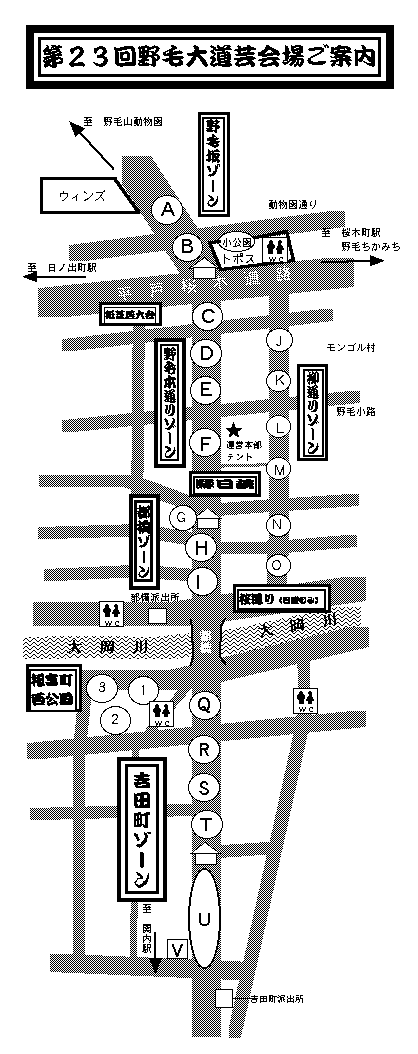 - 野毛本通り、柳通り、野毛坂、吉田町周辺の道路を交通止めして数十カ所のステージ位置を設け、